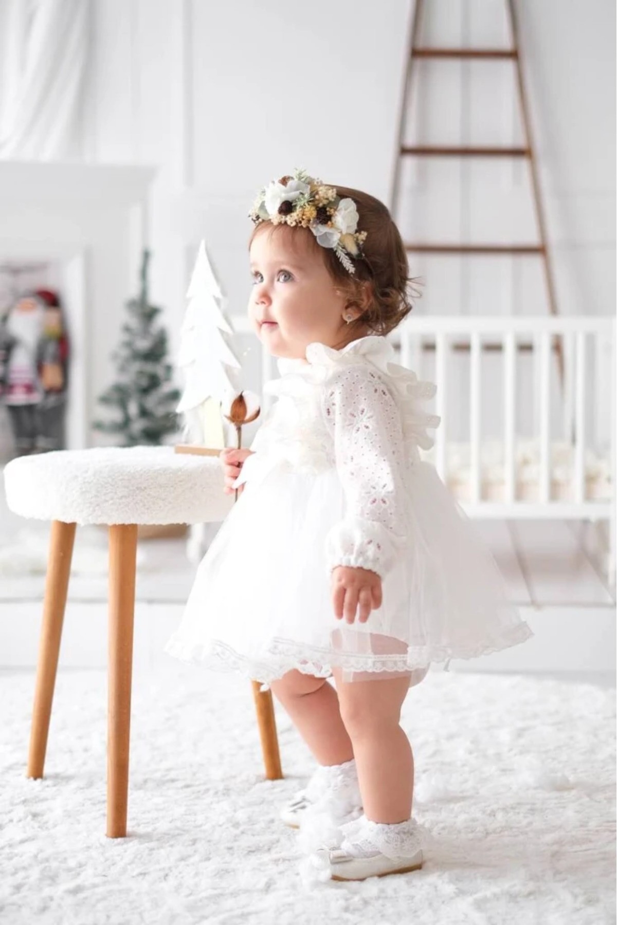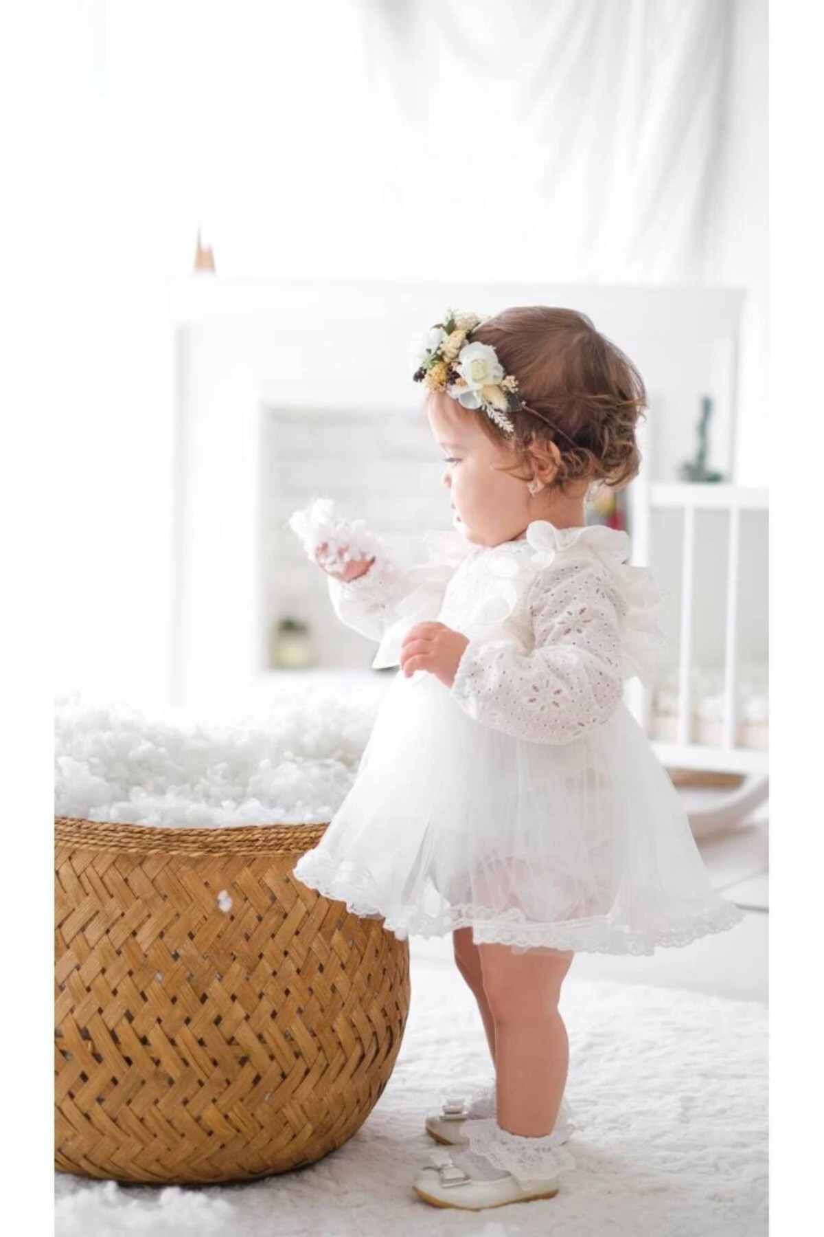 ELİSE Krem Yumuşak Tütü Romper Uzun Kollu Kız Bebek Elbise