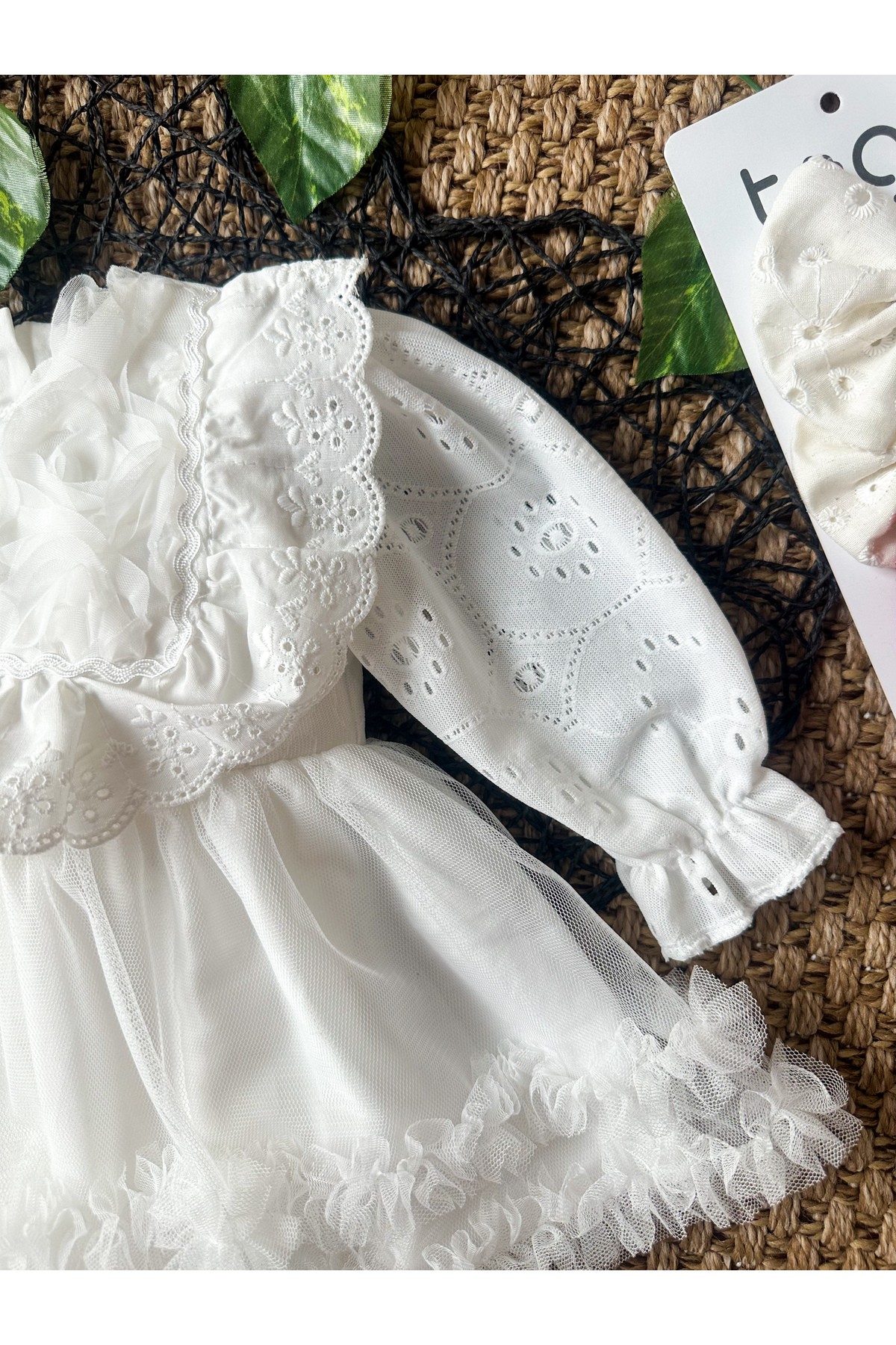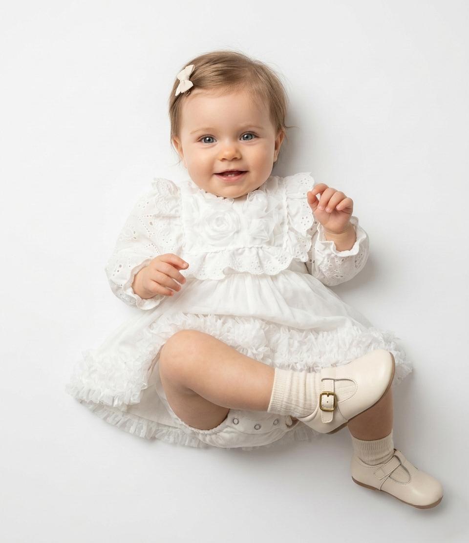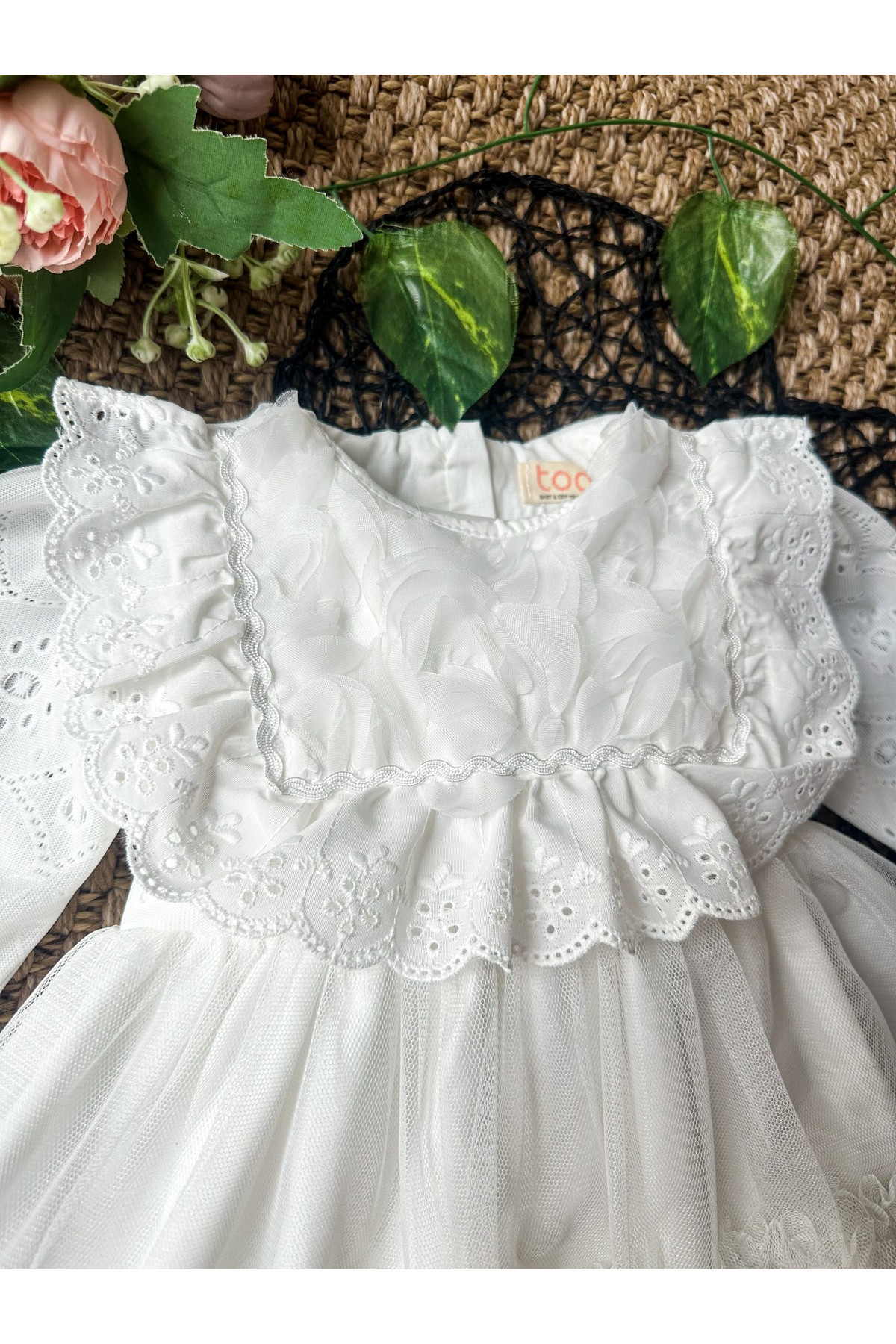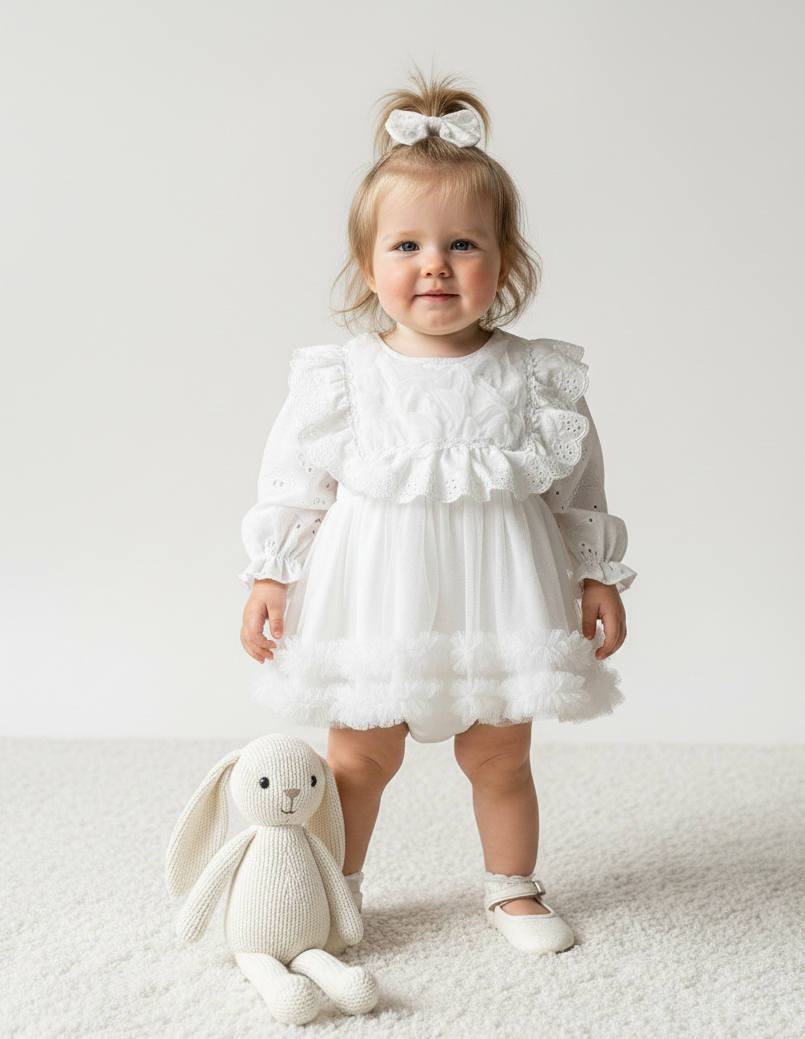 ASTER Beyaz Uzun Kollu Dantel Detaylı Etekli Kız Çocuk Bebek Özel Gün Bayramlık Elbise