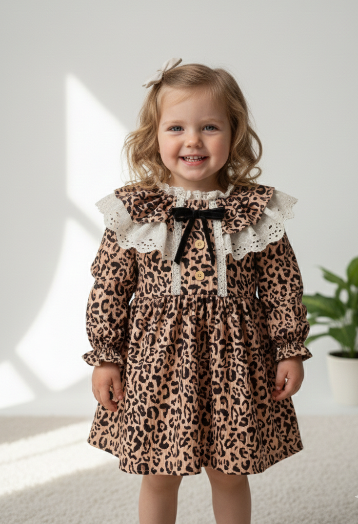 DİVA Leopar Dantel Yaka Detaylı Uzun Kollu Etekli Kız Çocuk Elbise