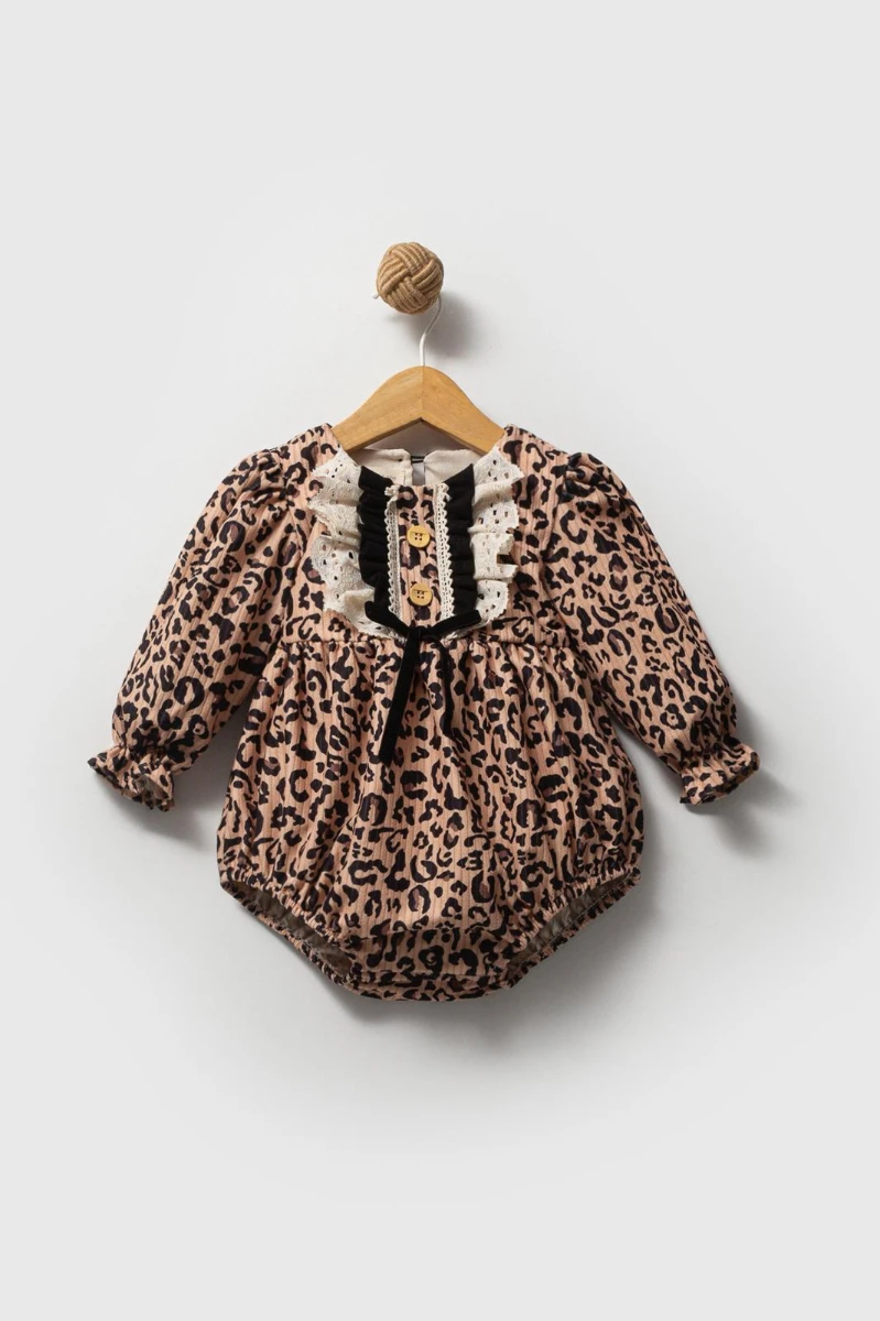 GRACE Leopar Desenli Uzun Kollu Dantel Detaylı Fiyonklu Kız Bebek Romper
