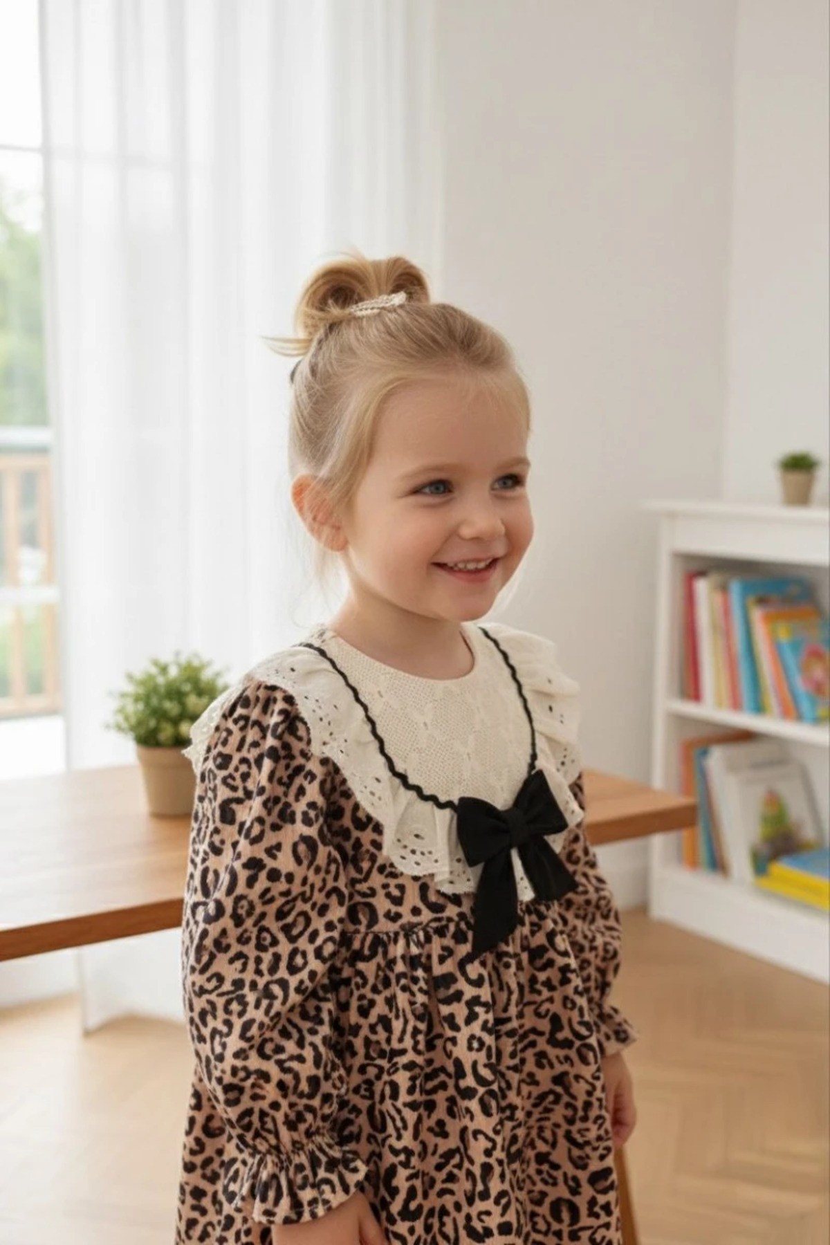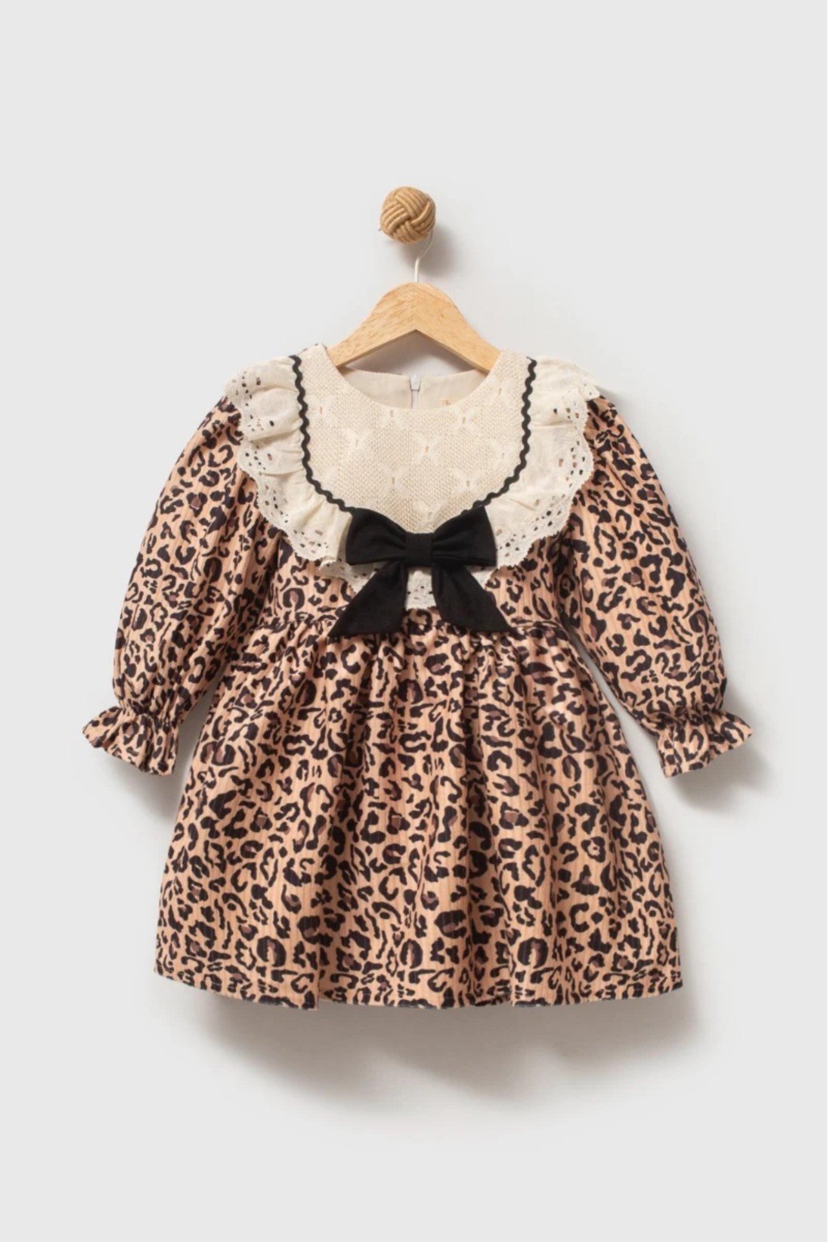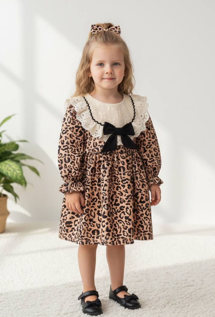 DİVA Leopar Dantel Yaka Detaylı Uzun Kollu Etekli Kız Çocuk Elbise