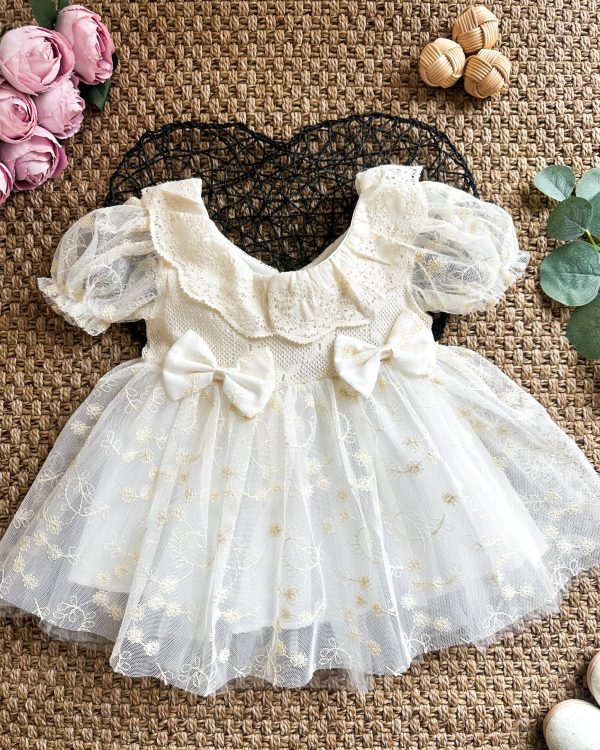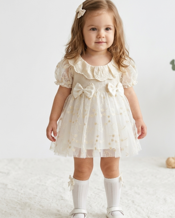 ASTER Beyaz Uzun Kollu Dantel Detaylı Etekli Kız Çocuk Bebek Özel Gün Bayramlık Elbise