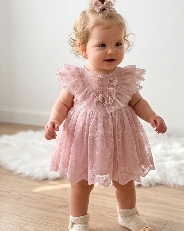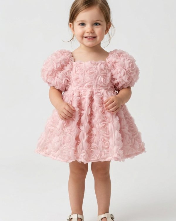 Rosa Güllü Kabarık Doğum Günü ve Özel Gün Kız Çocuk Bebek Elbisesi